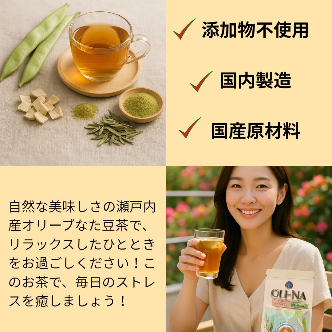 自然な美味しさの瀬戸内産オリーブなた豆茶で、リラックスしたひとときをお過ごしください!このお茶で、毎日のストレスを癒しましょう!