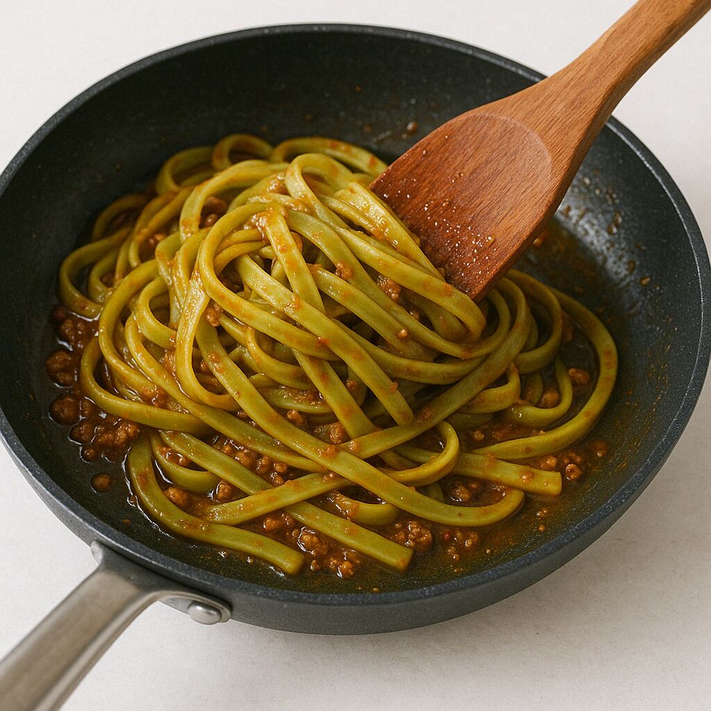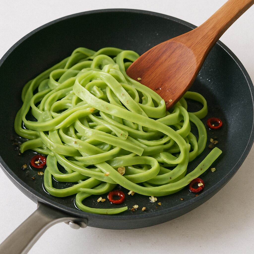 米粉にオリーブ葉粉末を配合して作られた「もっちり食感」の平麺パスタです。