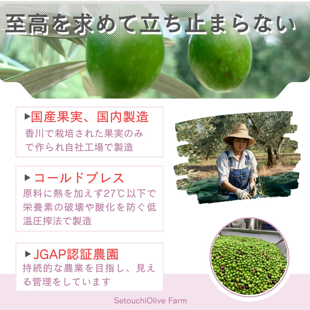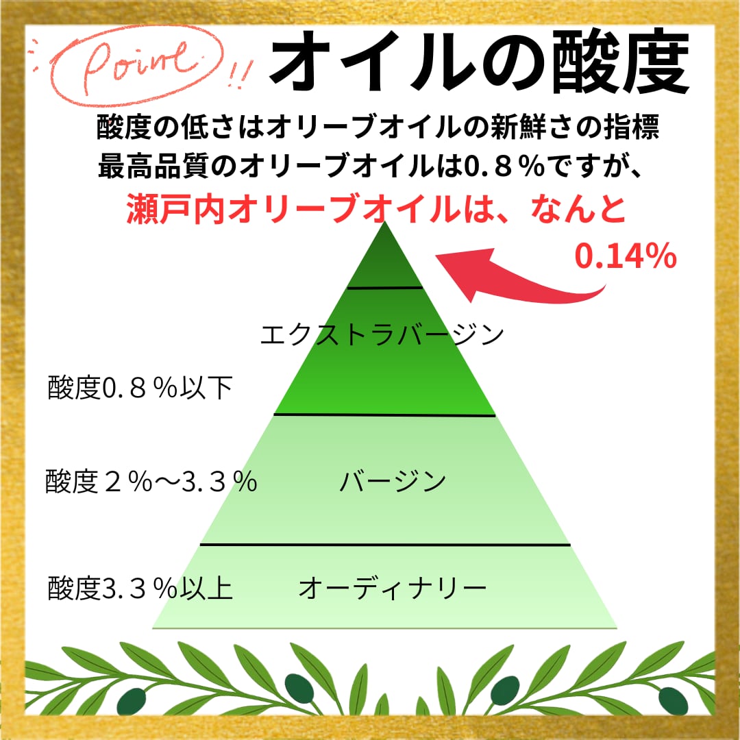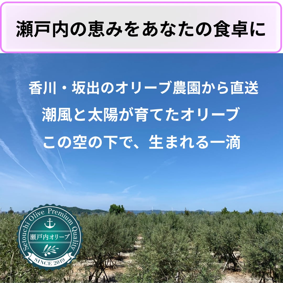 瀬戸内オリーブ園の自家栽培オリーブ果実、ミッション・ルッカな・コレッジョラなどの実を搾油時にブレンドしたエクストラバージンオリーブオイルです。ゴールドプレスで製造しました。鮮度の目安である酸度は0.14%です。